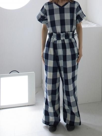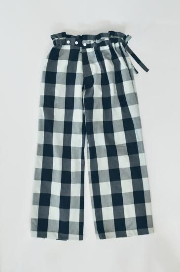 たっぷりとボリュームあるシルエットと、藍と白のコントラストが目を引くパンツ。ウエストにはゴムが入っていて紐でも調節できる仕様です。ユニセックス。厚みがある綿なので、まだ肌寒い春先から着られます。藍染糸を白に大胆に織り込んだ生地は、静岡・浜松で作られたもの。洗うたびに、藍染糸が白い糸に擦れることで、藍色が白い部分に移っていきます。だんだんと変化していく過程も楽しんでください。